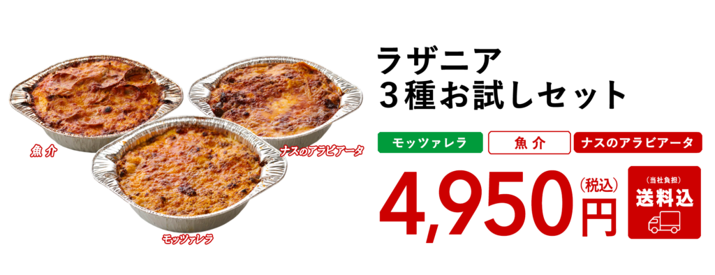 当店のラザニアは、作りたての美味しさをフレッシュな状態でお楽しみいただくため、すべて「冷凍の真空パック」にてお届けします。すぐに召し上がらない場合は、解凍せず冷凍庫で保存してください。